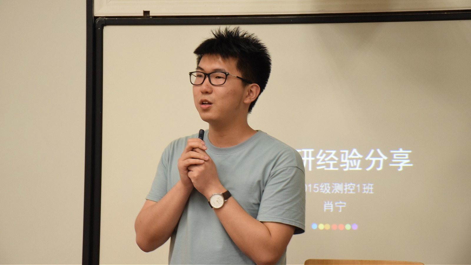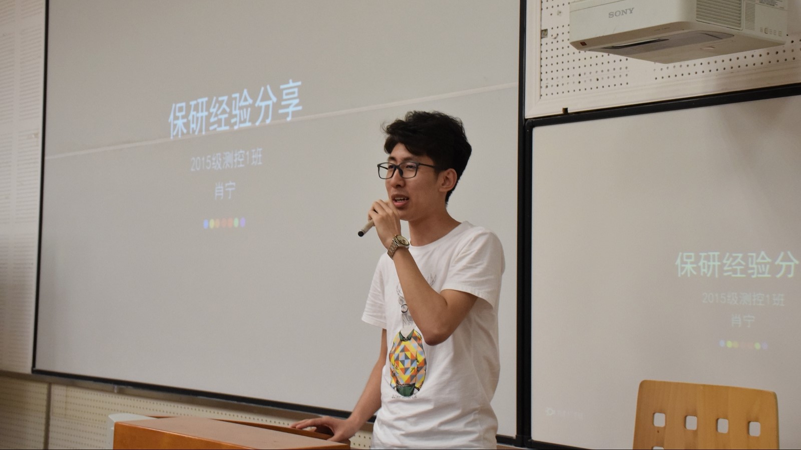 年级具体事务布置完毕后,学业经验交流会就正式开始了。第一个上台的是肖宁同学,他用心制做了PPT,详尽地跟大家交流了关于推免的整个流程。深刻剖析了从推免准备到研究生信息注册整个过程的注意事项,如不同学校对四六级与雅思托福的成绩要求,不同学校的夏令营的举办形式和在推免过程中综合绩点的计算方法等等。同时学长提醒同学们,在面试时,要提前准备稿子,同时你的资料上一定不能有不实,否则一旦在面试中被发现,会极大的拉低面试官你的评价,诚信是做人的底线。