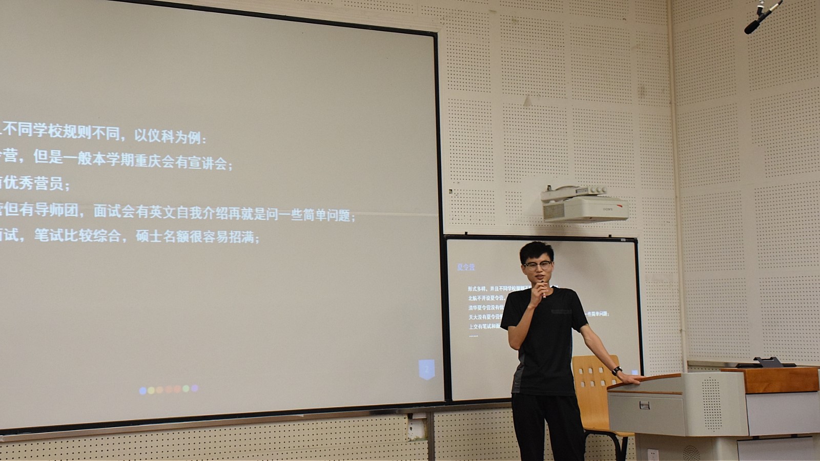 唐维伟和张智欣重点跟大家交流了保研中的各种竞赛及加分事项。张智欣的一句霸气的“因为保研只能加4分,所以我只加了4分”全场响起热烈的掌声。唐维伟重点分享了关于竞赛、项目等实施过程中可能会出现的一些问题及如何应对,以及具体时段参加什么项目等相关问题,让同学们受益匪浅。